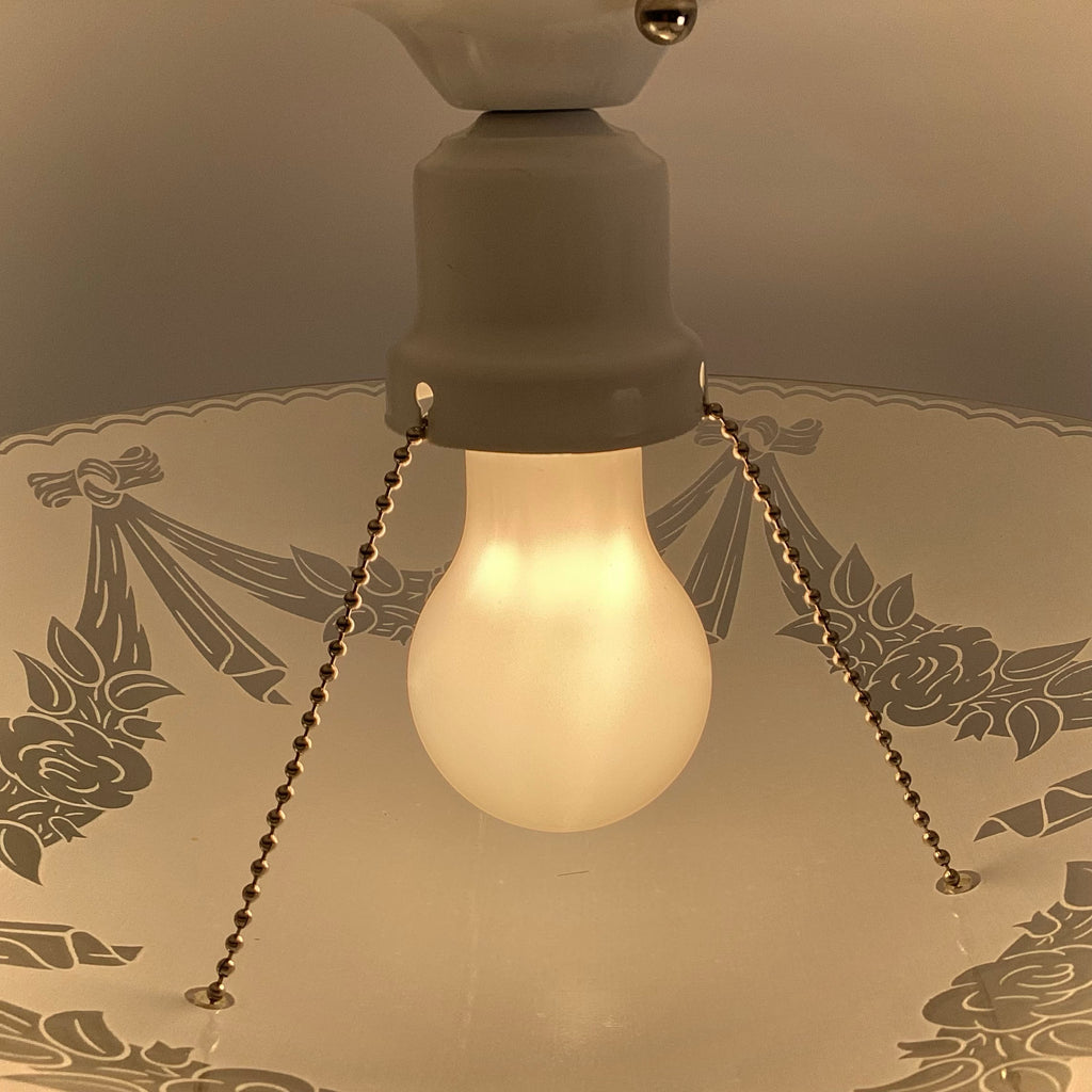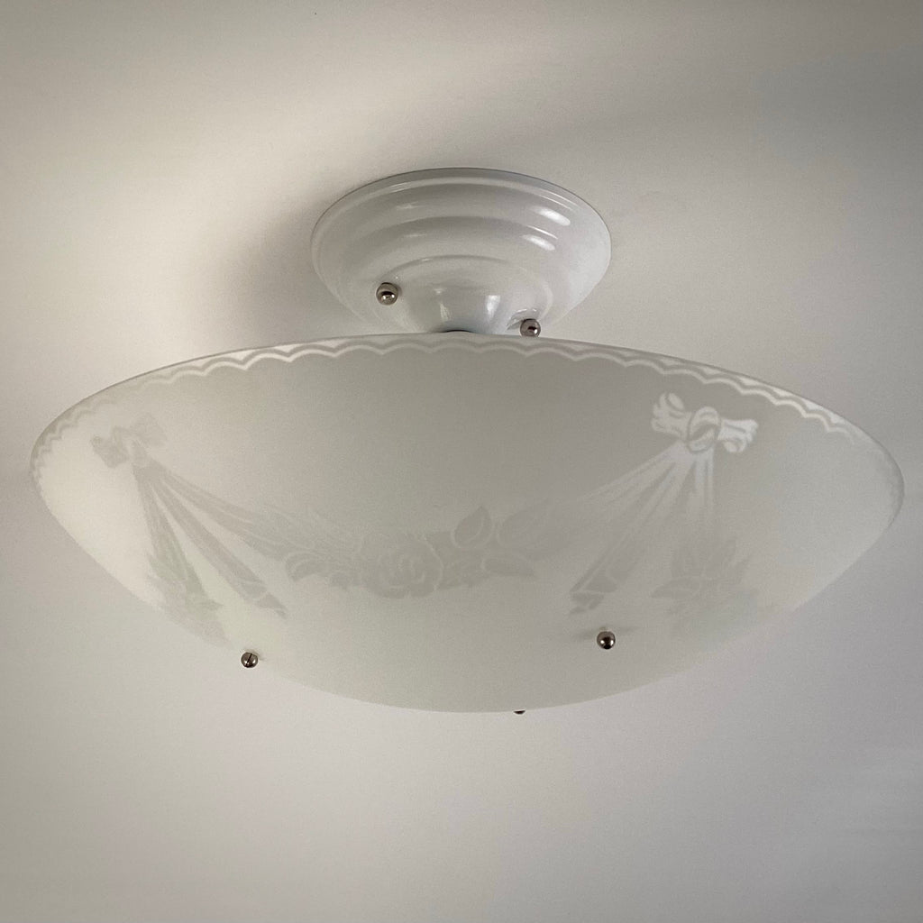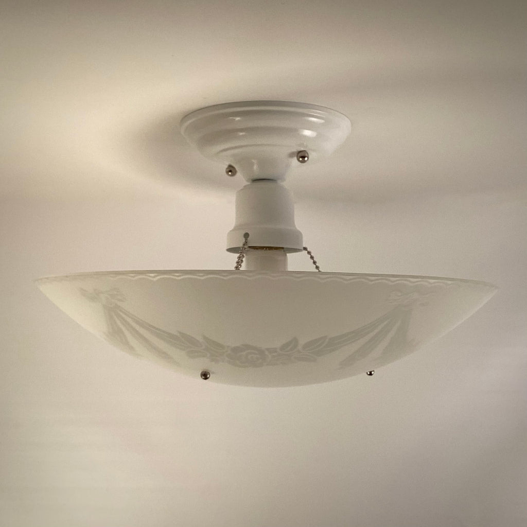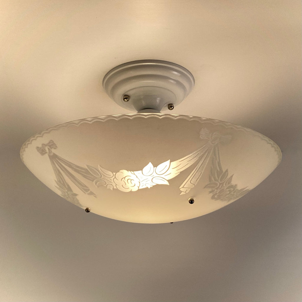 This vintage 1950s semi-flush ceiling light is a classic postwar fixture designed for everyday American homes. The shallow frosted glass bowl features applied white enamel floral garlands and ribbon swags, a popular early-1950s decorative detail that adds warmth without excess ornament.