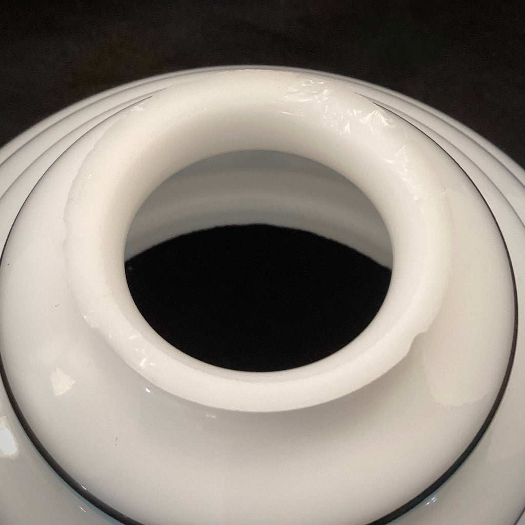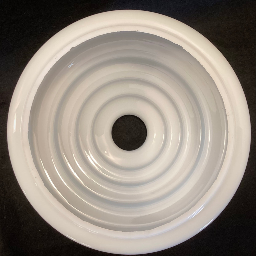 Condition: The ceiling light features a new cloth cord pendant fixture with a 2 1/4 inch shade holder and a vintage enamled glass shade. The new pendant fixture is U.L. Listed. The shade is in vintage condition and shows its antiquity with minor inconsistencies in the glass, including chips, nicks, and flea bites on the opening sides of the shade.
