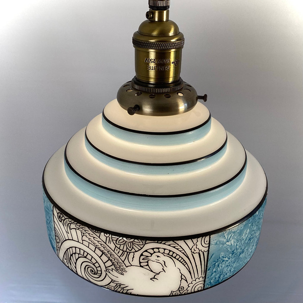 Add a touch of 1930s artistry to your interior with this Art Deco glass pendant light, featuring a beautifully detailed pheasant motif framed by stylized scrollwork and blue marbled glass panels. The stepped geometric form captures the era’s fascination with symmetry, motion, and craftsmanship, while the opal and sky-blue tones cast a soft, inviting glow.