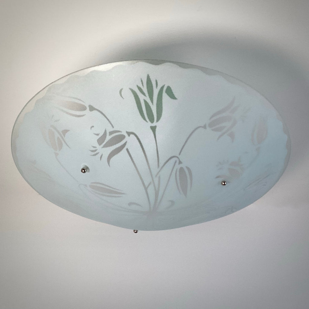 Bring soft postwar charm into your home with this vintage 1950s semi-flush ceiling light, featuring a beautifully frosted glass bowl with delicate enameled floral detailing. Designed during the early mid-century era, this fixture offers a warm, diffused glow that’s perfect for bedrooms, hallways, kitchens, or entryways.